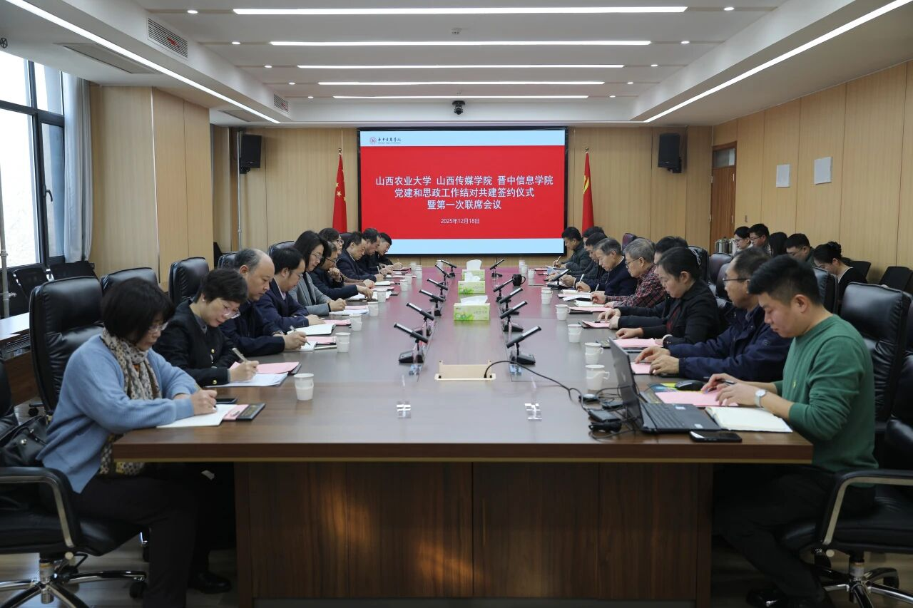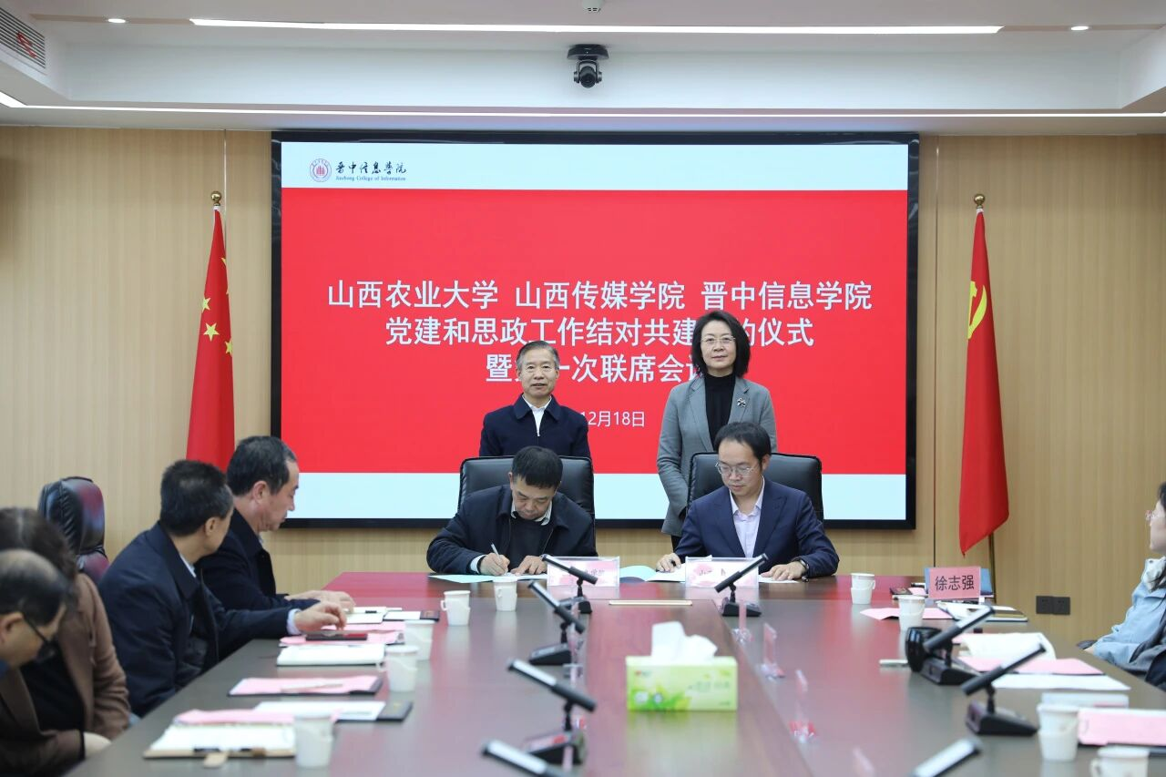 12月18日,我校、山西农业大学与晋中信息学院举行党建和思想政治工作结对共建签约仪式。校党委书记王铁梅、山西农业大学党委书记廖允成和晋中信息学院党委书记张存伟出席仪式并讲话。党委副书记、副校长周建新代表学校与晋中信息学院签订共建协议。组织部、宣传统战部、马克思主义学院(筹)负责人参加。