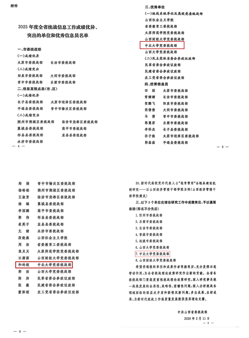 会上,我校统战工作荣获多项表彰:党委统战部首次获评山西省统战工作先进集体;同时荣获2025年度全省统战理论政策研究先进单位、2025年度全省统战信息工作优秀单位;1名统战干部获评2025年度全省统战信息工作优秀信息员。