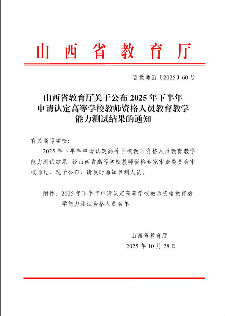 山西省教育厅关于公布2025年下半年申请认定高等学校教师资格人员教育教学能力测试结果的通知