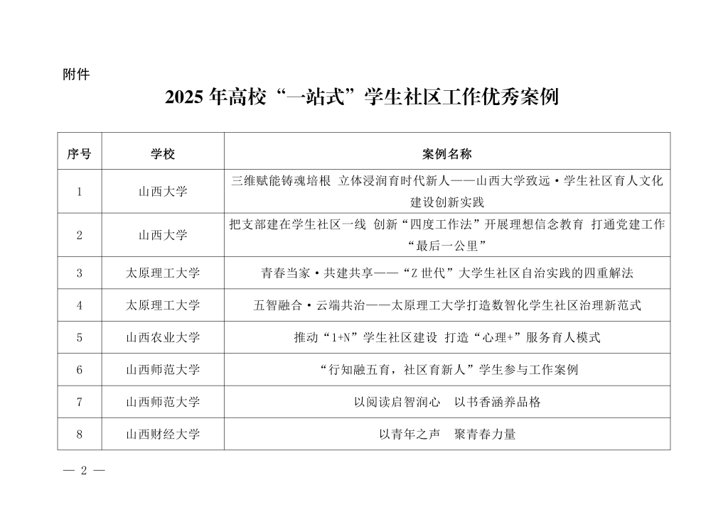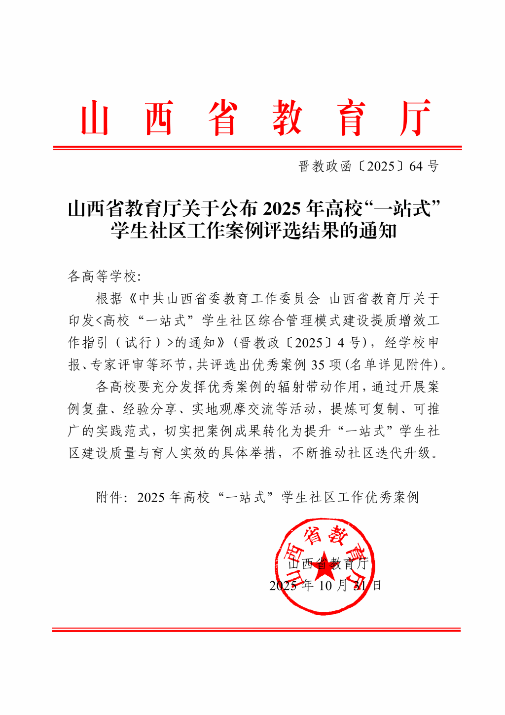 山西省教育厅关于公布 2025 年高校“一站式” 学生社区工作案例评选结果的通知