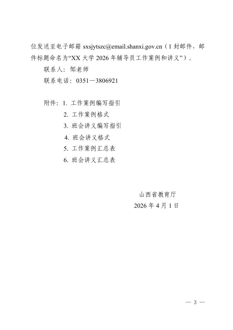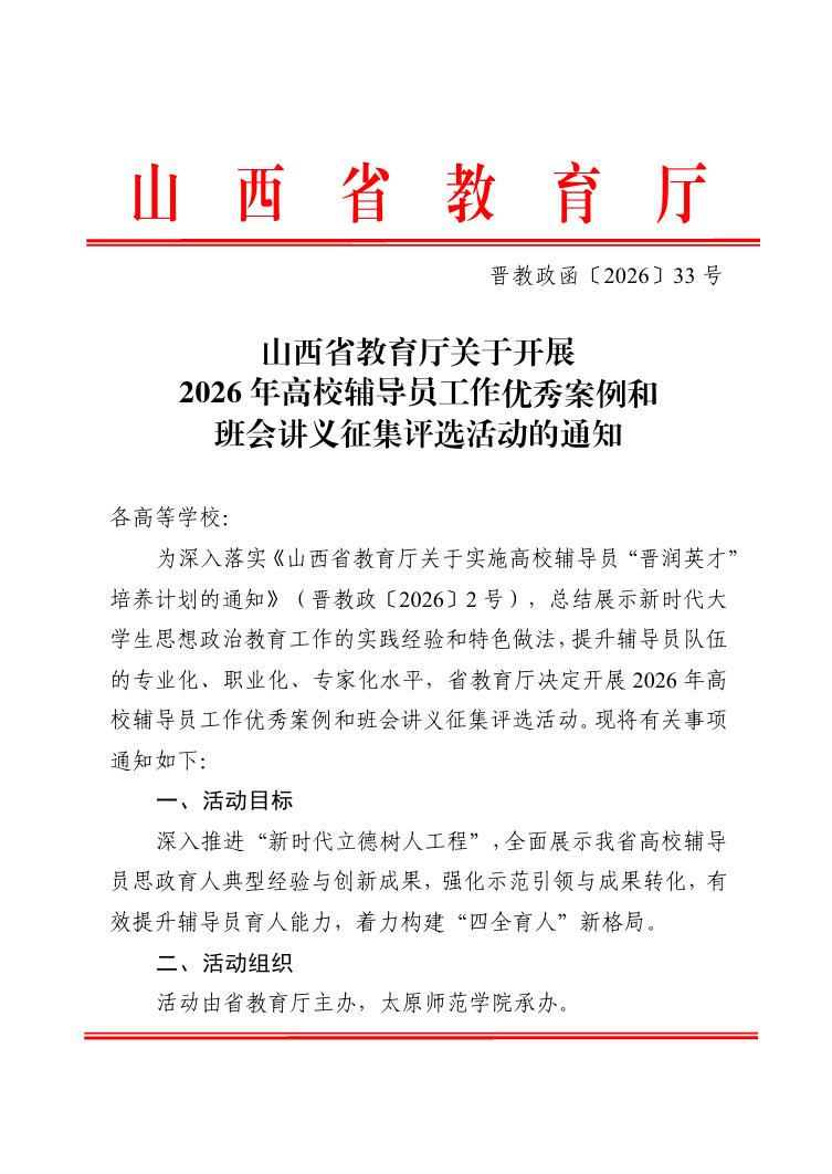山西省教育厅关于开展2026 年高校辅导员工作优秀案例和班会讲义征集评选活动的通知