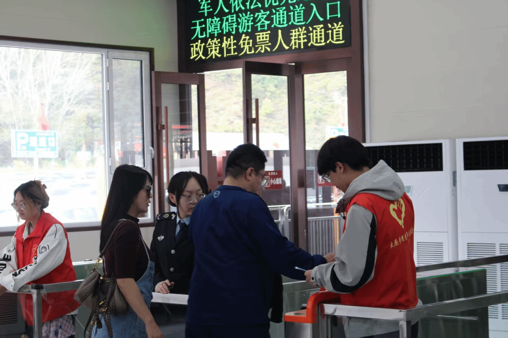 作为景区与太原学院首次合作的志愿服务力量,100余名大学生提前接受了系统培训。从倒热水时手托杯身的规范姿势,到公交指引时手掌摆动的标准角度,每一个服务细节都反复打磨,让初上岗位的他们快速成长为游客信赖的“贴心人”。志愿者与检票员队伍的紧密配合、高效联动,构成了游客进入景区的首个服务窗口,在景区服务中发挥着至关重要的前沿作用。志愿者们认真查验核对每一位游客的信息,确保检票工作快速、准确、有序地进行。
