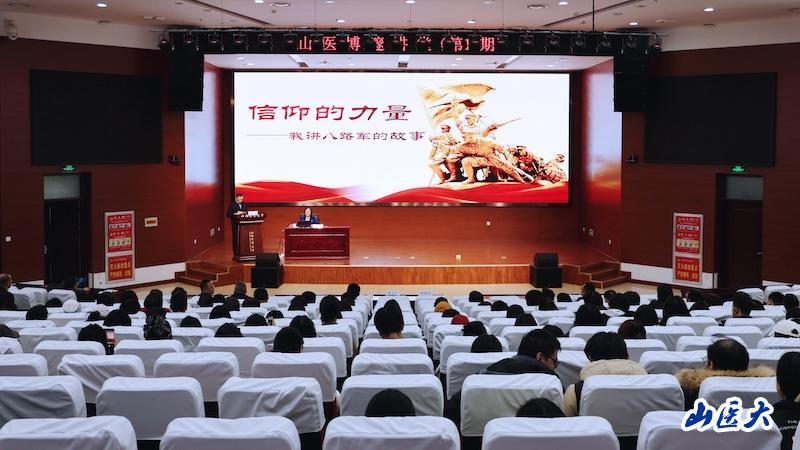 11月12日,“山医博邃讲堂”2025年第五期“传承红色基因 学思践悟中国共产党人精神谱系”示范宣讲活动在中都校区教学办公楼学术报告厅举行。八路军太行纪念馆第一代讲解员、首席讲解员、八路军研究会会员崔韶光老师应邀为师生讲授《信仰的力量——我讲八路军的故事》专题报告,学校师生300余人参加了报告会。校党委常委、副校长焦向英主持报告会。