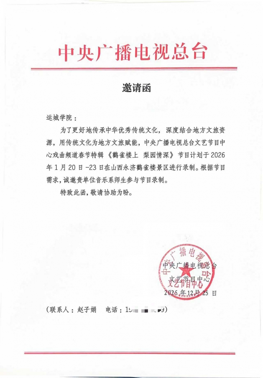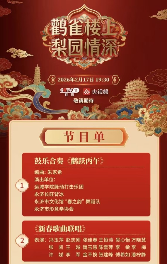 2月17日(农历正月初一)19时30分,中央广播电视总台CCTV-11戏曲频道新春特别节目《鹳雀楼上 梨园情深》准时播出。运城学院音乐系脉动打击乐团受邀参与节目开场录制,同永济背冰、永济飞狮、蒲州伞秧歌等山西本土非遗传统节目联袂呈现,以饱满热情与精湛技艺登上国家级舞台,展现学校艺术教育与实践育人成果,为全国观众献上融合打击乐韵律与戏曲文化底蕴的新春视听盛宴。
